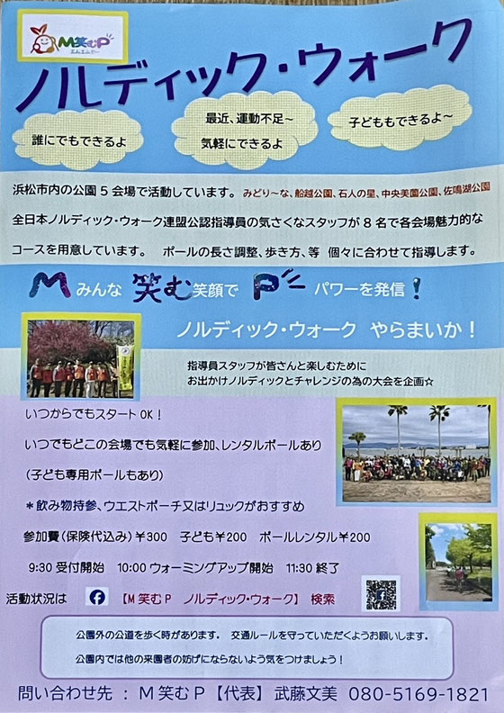 健康はままつ21推進協議団体のノルディック・ウォークグループ『M笑むP』の一員として活動中80代の方も元気に歩かれています。どなたでもご参加できます。体験なさって下さい。(画像参照)